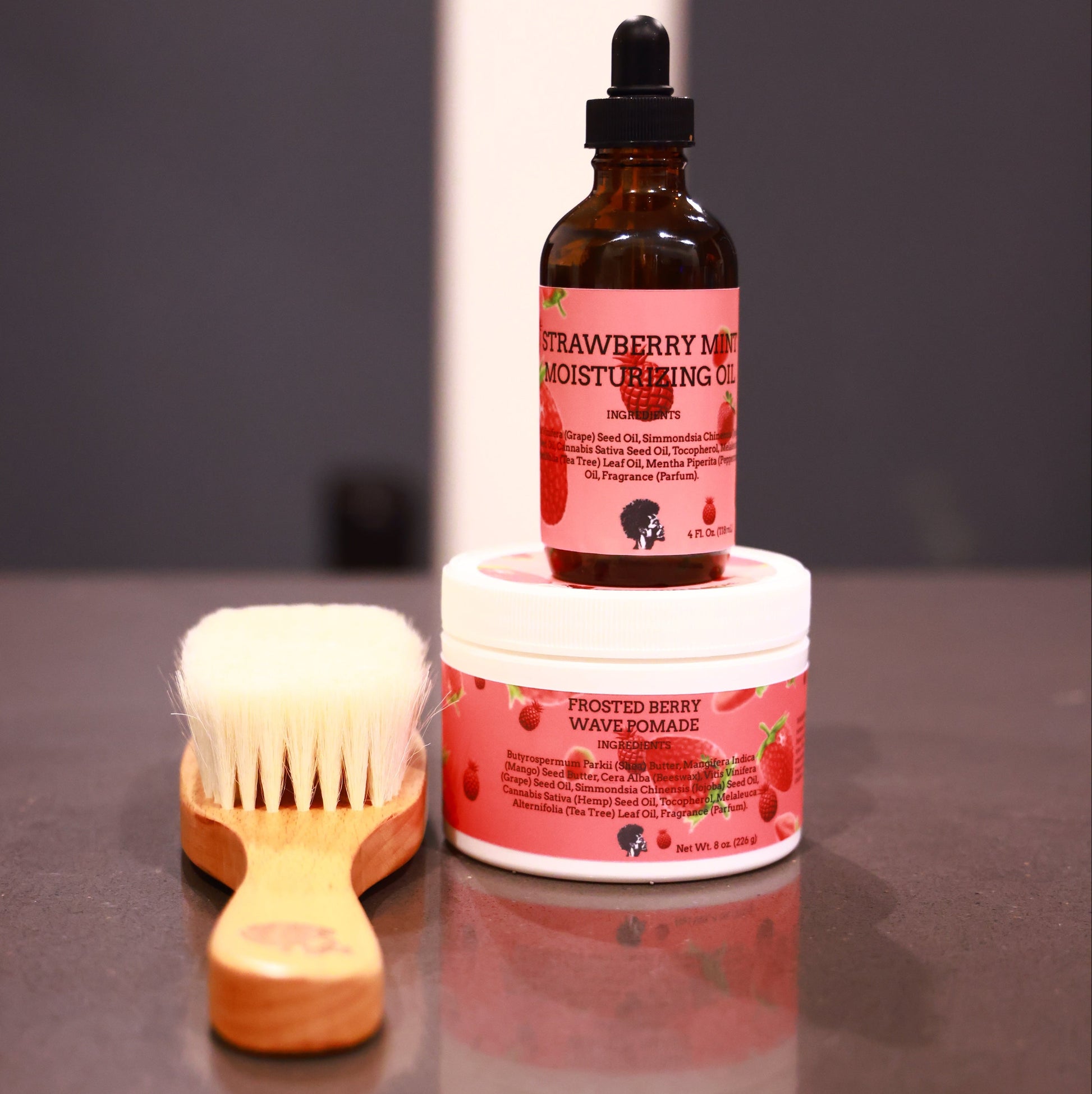 With this bundle you buy a brush and get an 8 Oz. Frosted Berry Butter and a 4 Oz. Strawberry Mint Oil Free of charge.