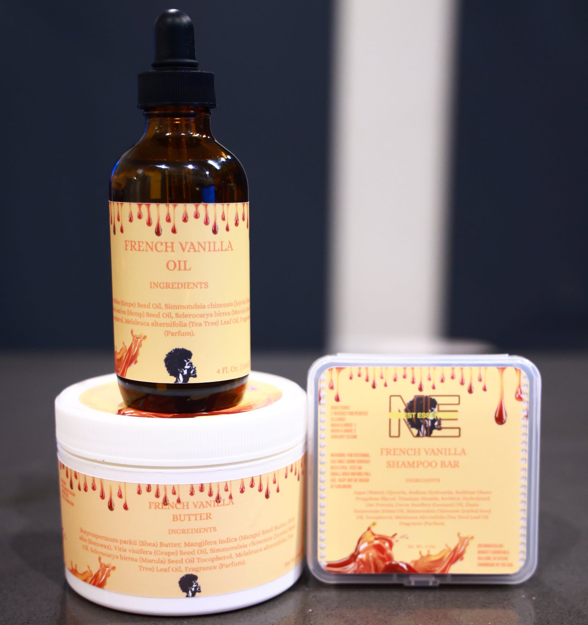 With this French Vanilla Shampoo Bar, Frosted French Vanilla Butter and French vanilla Moisturizing Oil, you can do a quick wash and go hydration routine before leaving out of the house.