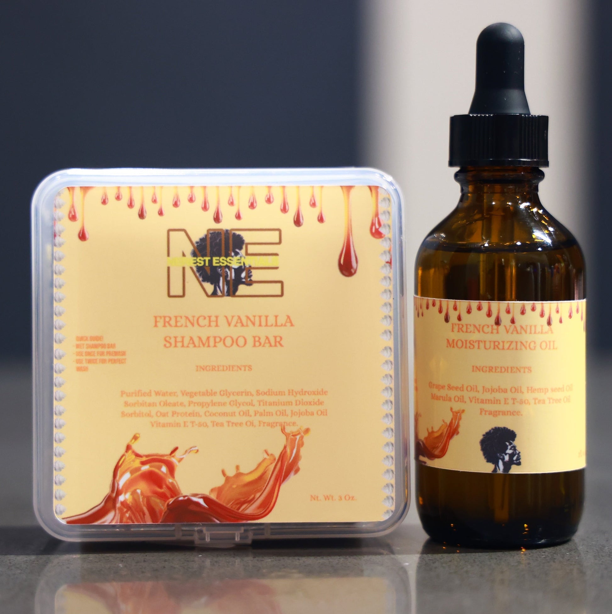 with this duo you get a French Vanilla shampoo bar along with a 2 oz. French Vanilla moisturizing oil to add shine and lock in moisture.